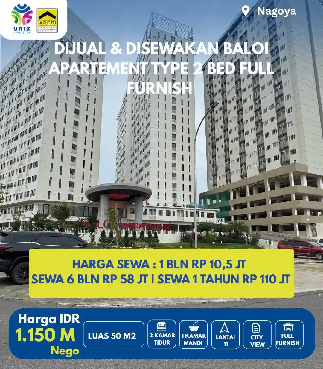 Apartemen modern di pusat kota Batam, lantai 11 posisi hook, sudah renovasi & full furnish, siap huni atau investasi.